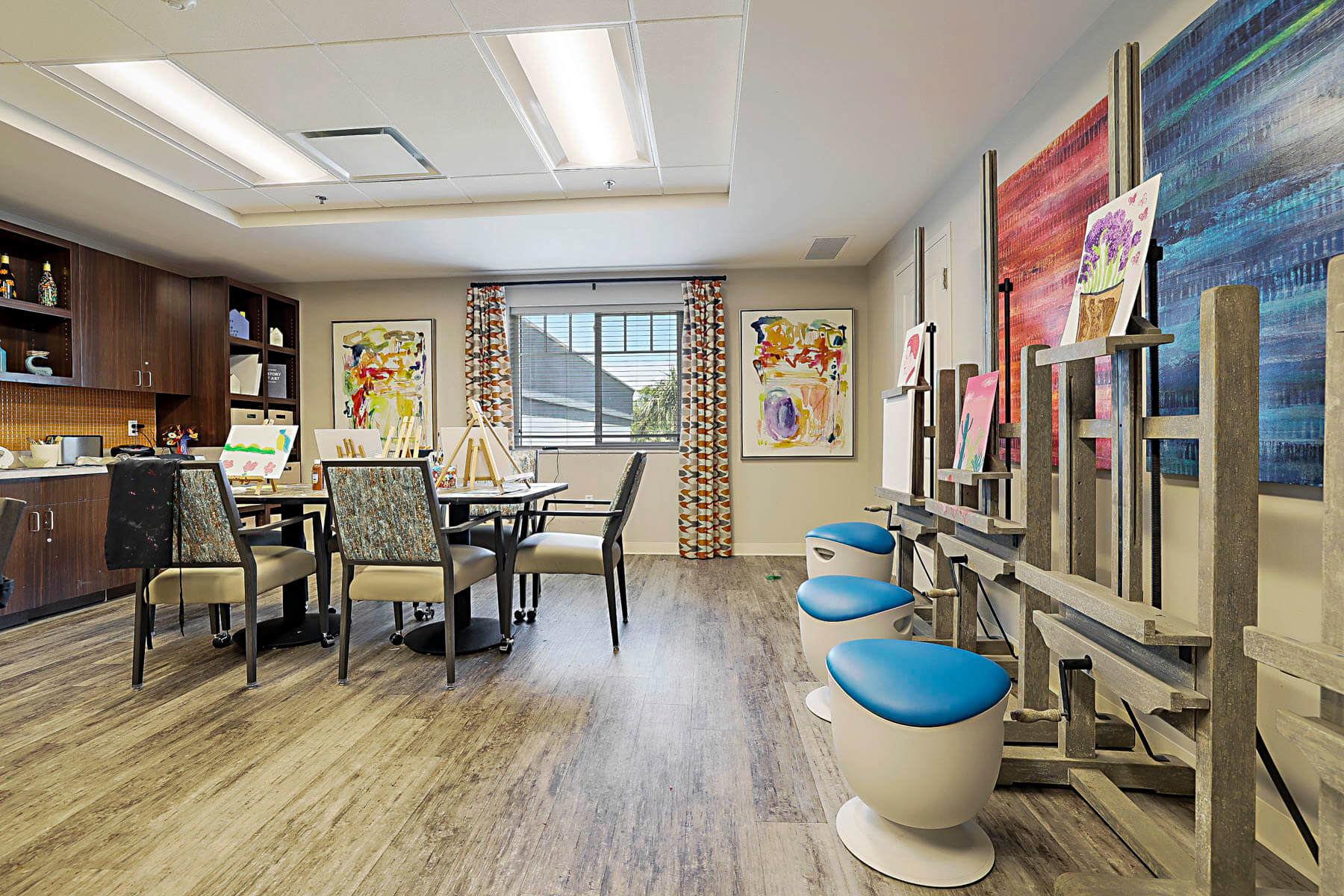 Interior and exterior enhancements prioritized high-visibility areas such as dining, activity, and memory care neighborhoods, with design decisions guided by durability, flexibility, and ease of reconfiguration. Accent colors, artwork, and lighting were used strategically to brighten interiors, support wayfinding, and reinforce neighborhood identity—achieving a cohesive transformation without unnecessary replacement or overspending.